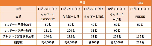 「ららぽーとeスポーツ杯関西地区No.1決定戦」は11月20日(日)から関西エリアのららぽーと4施設とREDEEで予選が行われました。予選を通じてeスポーツ大会への参加者は312名、eスポーツ試遊体験 509名の参加。観客も推定で約12,200名となるコロナ禍の規制緩和後初の大型オフラインイベントとなりました。