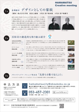 1000年の歴史を持つ家紋。その完成されたデザインの魅力を、家紋を手で描き入れる職人「紋章上繪師」から学びます。また、浜松市内の創造的な事業の実践者が取り組みを発表します。