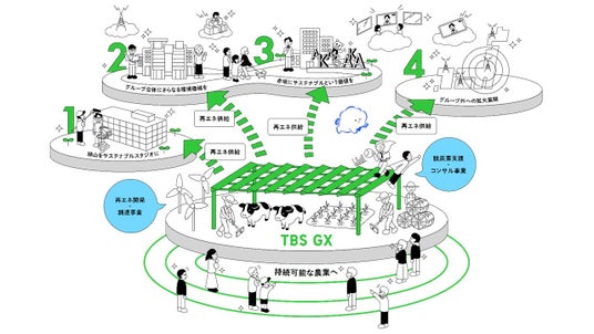 TBS GXにおいては、TBSグループ内で消費する再生可能エネルギー(以下、「再エネ」)の創出に向けて営農型太陽光発電所*1などを建設していく発電事業、第三者からの再エネ調達事業、そしてTBSグループ各社への脱炭素支援事業を展開します。将来的には、TBSグループ外への事業展開も検討していきます。