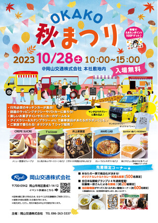 両備グループ(事務局:岡山県岡山市北区下石井、両備ホールディングス株式会社本社内)のタクシー事業を運営する岡山交通株式会社(本社:岡山県岡山市南区豊成1-14-12、代表取締役:古谷和秀)では、普段タクシーを利用する機会の少ない方々に、タクシーをもっと身近に感じていただこうと、イベント「OKAKO秋まつり2023」を開催いたします。