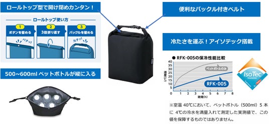 開け閉めカンタンでお出かけや通勤・通学時のサブバッグに使える『保冷ロールトップバッグ(RFK-005)』が登場!さらに、人気アイテムであるソフトクーラーや、バッグインバッグがリニューアル!