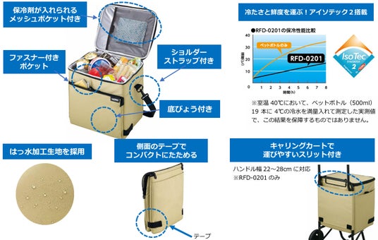 『ソフトクーラー(RFD-0051/0151/0201)』は、お弁当の持ち運びやアウトドアシーン、週末のまとめ買いまで活用できるソフトクーラーです。このたび、日常使いやアウトドアなど様々なシーンに合わせて選べるカラーにリニューアルしました。また、複数の素材を組み合わせた5層断熱構造「アイソテック2」を採用し、保冷力が抜群です。外側は、はっ水加工を施し、雨の日も安心して使用することができます。内側は汚れをふき取りやすい生地で、衛生的に使用できます。
