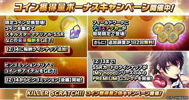 「スキルスターマテリアル:SSR」など豪華アイテムと交換できる限定コイン交換をはじめ、ビンゴミッションやログインボーナス、KILLER SCRATCH!!をプレイした際のコイン獲得量が2倍になるキャンペーンなどを開催しています。