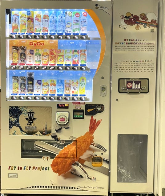家庭や店舗などで発生する廃食用油という国内資源を原料とするSAF(※1)を用いて航空機が飛ぶ世界を実現するFry to Fly Projectの取組みに東京メトロ、ダイドードリンコが賛同し、自動販売機を通じて広く社会に発信し取組みの輪を広げるために本自販機を企画するとともに、Fry to Fly Projectのシンボルデザインを全面にラッピングしました。東京メトロ、ダイドードリンコ、ならびに日揮HDの3社は、この機会に、駅をご利用される方々にFry to Fly Projectを知っていただき、持続可能な社会の実現に向けた取組みの理解促進につながるよう期待しております。