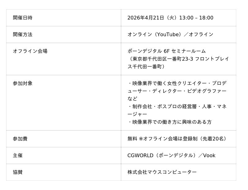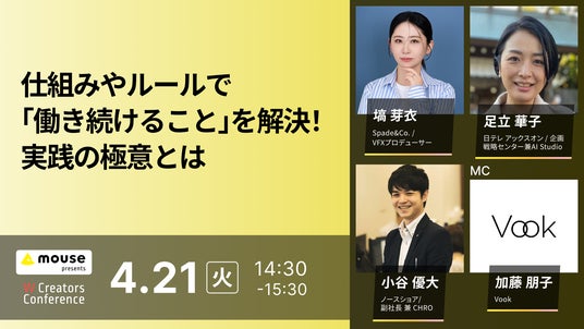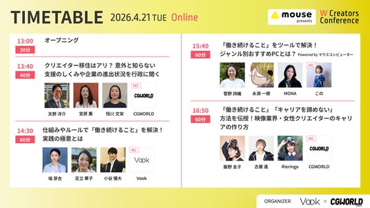 株式会社ボーンデジタル(本社:東京都千代田区、CEO:新 和也、URL:https://www.borndigital.co.jp/、以下ボーンデジタル)は、株式会社Vook(本社:東京都港区、代表取締役:岡本 俊太郎、以下Vook)との共催により、カンファレンス『W Creators Conference「働き続けられない」問題を解決する』を2026年4月21日(火)に開催いたします。