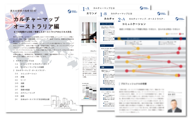 インサイトアカデミーでは、独自にプロッティングした65か国の中から、この度“オーストラリア”をピックアップし、8つの指標を説明するとともに、日本との違いを定量 / 定性の両面から分析し、オーストラリアビジネスのプロフェッショナルによる8つの指標毎の考察を盛り込んだ「国別カルチャーマップ オーストラリア編」をリリースいたしました。