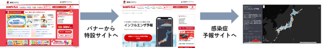 「SOMPO Park」のトップページや会員向けのメルマガから、感染症予報特設サイトに遷移する導線を設置します。特設サイトでは、感染症予報サイトの視聴を促すとともに、保険関連情報など利用者にとって有益な情報を掲載します。