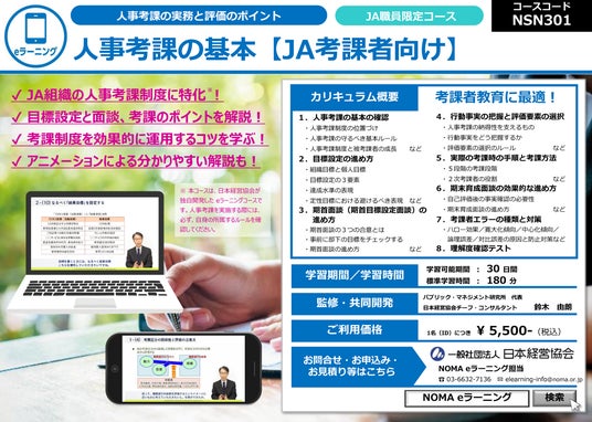 一般社団法人日本経営協会(本部事務局:東京都渋谷区、会長:高原 豪久)は、JA組織における人事考課担当者に向け、人事考課を公正・効果的・円滑に実施するための知識とスキルを解説したNOMA eラーニング「人事考課の基本【JA考課者向け】」の提供を開始いたします。