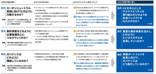 当社の統合報告書は、投資家をはじめとするステークホルダーの皆さまの疑問に真正面から向き合い、対話するためのツールと位置付けています。今年度は、昨年度にステークホルダーの皆さまからの「6つの問い」への回答に対していただいたご意見や当社の取り組みの進捗を踏まえて改めて問いを立て直し、さらに踏み込んで回答する構成としました。