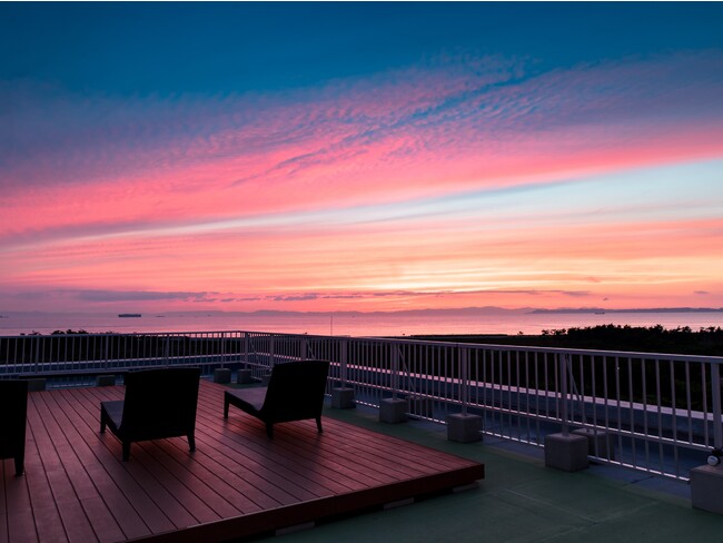 毎日夕方にご案内する「夕暮れテラス」。テラスからは伊勢湾、三河湾や鳥羽、知多、神島など360°のパノラマビューが楽しめます。日の入り時間に合わせてカフェコーナーを設置。菜の花和紅茶を飲みながらスタッフが簡単な解説をします。