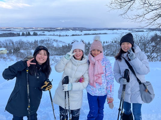 また、スキー・スノーボード以外のアクティビティにも興味がある生徒のオプショナルツアーとして、北海道を代表する風景として知名度が高い美瑛町を訪れました。美瑛では、ふかふかの雪の上で自由に歩き回るための「西洋かんじき」、スノーシューを装着して、スノートレッキングを体験しました。平坦でも傾斜のある場所でも、足を踏み入れた所に沈み、そのまま埋まってしまうような深雪の中を、ガイドの案内でスノーシューで突き進むことで、冬ならではの美瑛の丘陵風景を楽しむことができました。仲間と一緒に様々な活動に取り組み、夢中になって雪と触れ合い、新しい発見をしながら、知識や経験の幅を広げることができた本研修は、心に残る思い出となったはずです。
