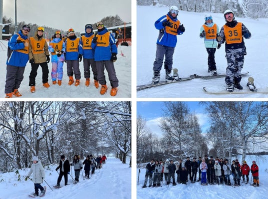 世界23カ国から生徒が集う国際高等学校には、すでに国内外のスキーリゾートでウィンタースポーツの経験を積んでいる上級者から、今回の研修で初めて雪に触れる初心者の生徒もいるため、レベル別のグループに分かれ、それぞれの経験値とスキルに合わせてスキー又はスノーボードの技術向上に打ち込みました。滞在期間中、富良野では降雪が続いたため、学校のキャンパスがある愛知県では絶対に見ることができない、新雪に覆われた白銀の世界に生徒たちは興奮しました。