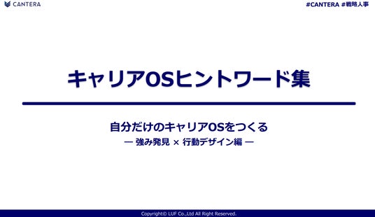 LUF株式会社(本社:東京都港区、代表取締役:堀尾 司)は、人事向けリスキリングプラットフォーム「CANTERA ACADEMY」にて先日公開し「自分のキャリアと初めて真剣に向き合えた」と大きな反響を呼んでいる人事向けキャリア設計講座『キャリアOSをアップデートする』の中から、特に「自分の価値をプロの言葉で定義できた」との声が多かった『キャリアOSヒントワード集』を、無料公開いたしました。