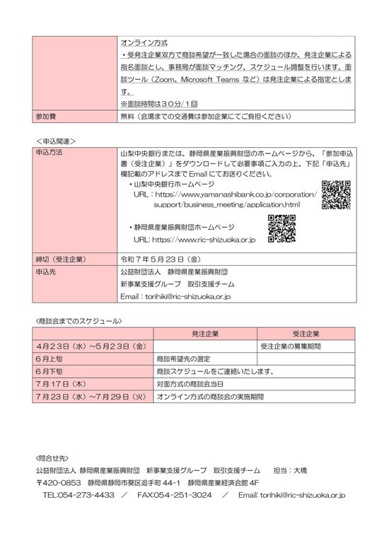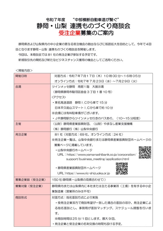 株式会社山梨中央銀行(代表取締役頭取・古屋 賀章)、株式会社静岡銀行(代表取締役頭取・八木 稔)、公益財団法人やまなし産業支援機構(理事長・山本 盛次)、公益財団法人静岡県産業振興財団(理事長・中西 勝則)は、山梨県および静岡県内の中小製造業の受注機会の創出ならびに販路拡大を目的として、「“中部横断自動車道が繋ぐ”山梨・静岡 連携ものづくり商談会」を開催します。