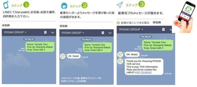 ●予約方法:H.I.S.専用の配車受付LINEアカウントの「hisryoaki」をLINE友達に追加し、「お客様のお名前」「配車場所」「行き先」 を英語メッセージでお送りください。