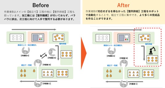 「姿勢変更」「方向揃え」「整列供給」「位置決め」「目視検査」などの、特に人手からの解放が急務とされる5つの工程を容易に自動化することで、作業者がよりコア工程に集中できます。これまで人の手で培ってきた中堅製造業の【製造技術】【固有の強み】を維持したまま、工場全体の生産能力向上を支援します。