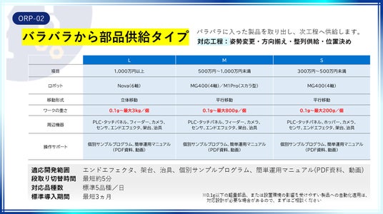 本サービスは、「一日5品種を標準対応」、「導入後、即工程生産能力を10%向上」、<機器・設計・開発・設置>の費用を“ぜんぶ込み”にした「圧倒的な低価格 (300万円から)」、導入前の<調査・構想コスト>を削減し「導入企業のプロジェクト負荷低減」」を叶える、ロボット・周辺機器・操作手順を備えた実証済みのオペレーション・ロボット・パッケージです。