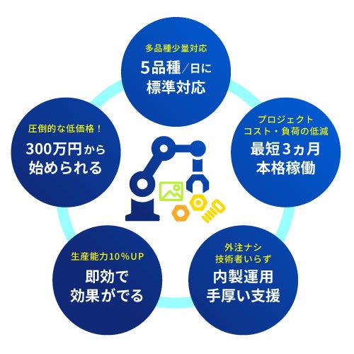 「即効性」(実証済みの最適化されたシステム)、「圧倒的低価格」(機器・設計・開発・設置の費用を“ぜんぶ込み”)、「プロジェクト負荷低減」(導入前の調査・構想コストも大幅に削減)、そして「多品種少量生産への対応」。これらを実現した革新的なサービスです。