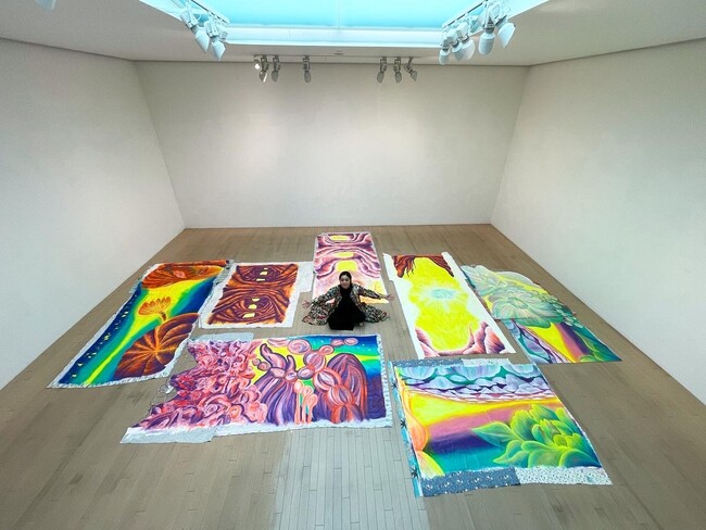 ASUKA氏は、幼少期からファッションへの興味が高く、会社勤めをしながら洋裁を学び、2017年にデザイナーに転身し、自身で描いた絵を布生地の柄にして洋服を仕立て、完全にオリジナルのブランドを立ち上げました。コロナ禍を期に、キャンバスに絵を描くことに目覚め、本格的に画家としても活動を開始。昨春には、ドバイ出展のオファーを受け、海外デビュー、夏には長年の夢だった沖縄県立美術館での個展も実現。2023年以降もパリとドバイへの出展が決定しており、沖縄から海外へ積極的に活動を広げています。