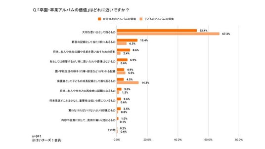 ・保護者自身・子どもの卒園・卒業アルバムともに「大切な思い出として残るもの」という価値がトップ