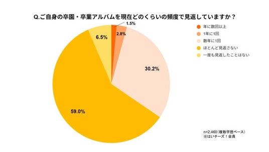 保護者が受け取った自身の学生時代の卒園・卒業アルバムは61.7%が実家に保管されており「ほとんど見返さない」「一度も見返したことはない」と回答した人は65.5%となりました。
