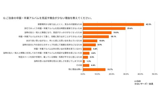 見返さない理由としては「取り出しにくく、見るのが面倒なため(42.5%)」「多忙でゆっくり卒園・卒業アルバムを見る時間を確保できないため(29.6%)」など、物理的・時間的な制約から日常に取り込めないという実態が浮かびました。