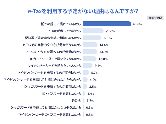 一方、e-Taxを利用しない理由については、1位「紙での提出が慣れている(48.8%)」に続き、「e-Taxが難しそうだから(20.8%)」「e-Taxでの申告のやり方がわからないから(14.4%)」が挙げられています。「ICカードリーダーを買いたくない(13.0%)」という、制度への誤解がハードルとなっている例も見受けられました。