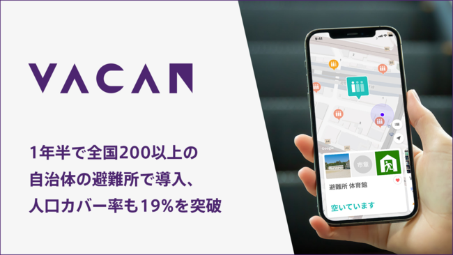 AIとIoTを活用してあらゆる空き情報を配信するスタートアップ、株式会社バカン(東京都千代田区、代表取締役:河野剛進)が提供する、リアルタイム空き情報配信プラットフォーム「VACAN」は、2022年2月に全国で200を越す自治体への導入を達成しました。これにより、災害時には13,000カ所以上の避難所の混雑情報をリアルタイムに可視化することが可能となります。サービスの日本での人口カバー率は、2月末時点で19%を突破しました。コロナ禍や出水期を控える中、予期しない災害に備え全国の自治体での導入が加速しています。