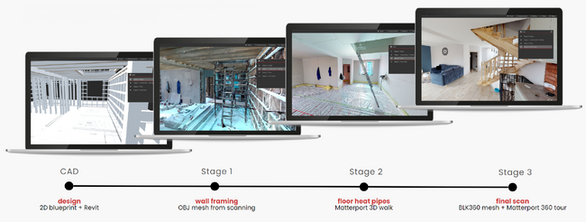 「Stages(ステージーズ)」は、施工段階ごとにMatterportシステム等のVR撮影/3D測量により取得できるVR撮影データを使い、施工管理の質と効率性を向上できるサービスです。建設中から完成までの各段階の3D空間画像を重ね合わせ、視覚的に分かりやすいVR空間上で施工履歴管理が実現します。