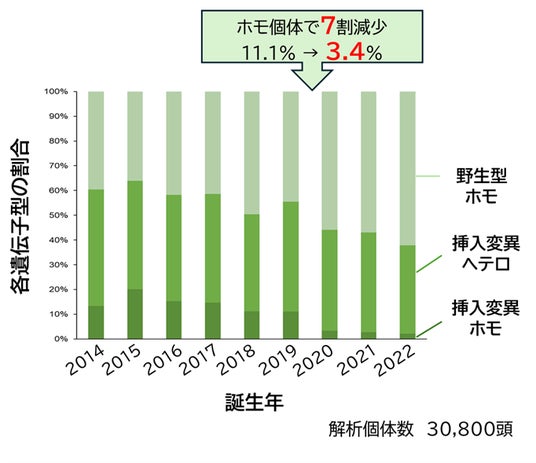 2014年から2022年までに生まれたミニチュア・ダックスフンド30,800頭の遺伝子型データを解析した結果、リスクアレルのホモ接合個体の割合が、全頭での検査が本格的に開始された2019年から翌2020年にかけて、約70%減少(11.1%→3.4%)しました。これは、ブリーダーやペットショップが遺伝子検査の結果に基づき、リスクの高いホモ接合個体の繁殖を避けるという適切なブリーディングが短期間で効果を発揮したことを示しています。