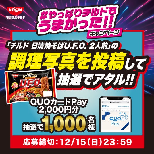 10月15日(火)から12月15日(日)までの期間中、Xにてチルド日清焼そばU.F.Oプレゼントキャンペーン公式アカウント(@nsc_ufo_CP)をフォローの上、調理した「チルド日清焼そばU.F.O. 2人前」と商品パッケージを一緒に撮影し、指定のハッシュタグをつけて投稿した方の中から抽選で1,000名様にQUOカードPay 2,000円分がプレゼントされます。