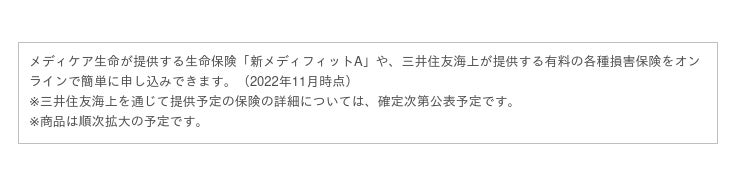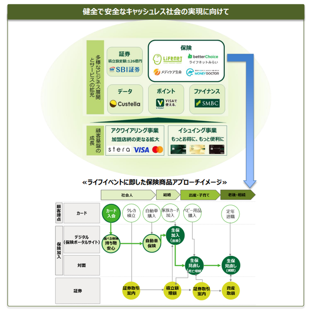 今回、従来の資産運用ビジネスに加えて、新たにお客さまの豊かなライフステージに必要不可欠な「生命保険」「損害保険」を、より適切なタイミングで、より必要な内容でご提案できるよう、事業者との協業を含めた保険ビジネスを本格化し、近年のデジタル化を踏まえ、Vpassアプリを活用したデジタルとリアルをシームレスに融合した保険サービスの提供によって、お客さまのライフイベントをサポートさせていただきます。