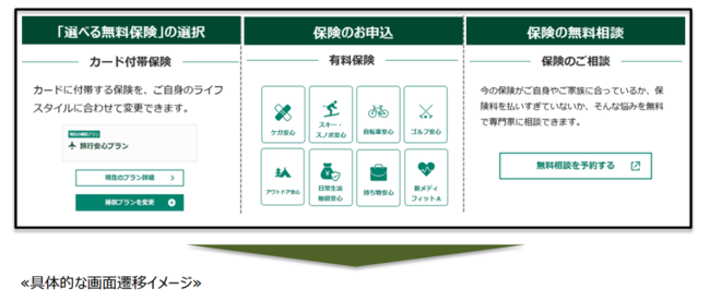 特徴は大きく4点、「選べる無料保険(カード付帯保険)の選択」、「生命保険・損害保険の申し込み」、「加入履歴の確認や諸手続き」、「保険の無料相談」など、お客さまのニーズに合わせた商品・サービスのご提供が可能となります。なお、商品・サービスについては、今後拡充していく予定です。