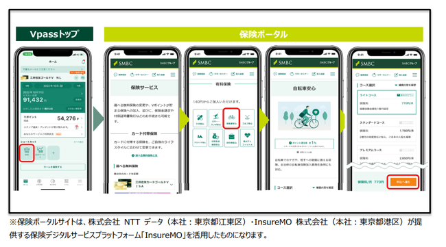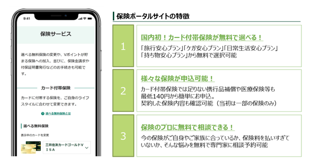 三井住友カードでは、会員向けVpassアプリを通じ、デジタルを起点に様々なサービスにお申込みいただけます。今回、保険のお申込み、契約内容の確認、専門家へ各種ご相談いただけるサービスを開始することで、お客さまのライフステージに応じたお客さまのニーズに対してタイムリーに応えてまいります。また、「保険ポータルサイト」を通じて、保険をお申込み・決済いただくことで、お得にVポイントを貯めていただくことも可能となります。