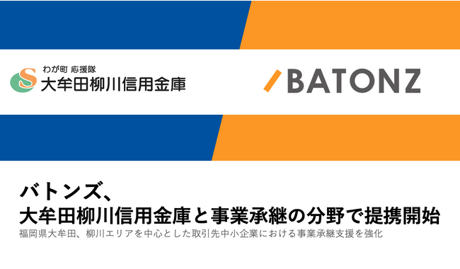 M&A総合支援プラットフォーム「BATONZ(バトンズ)」を運営する株式会社バトンズ(本社:東京都中央区、代表取締役CEO:神瀬 悠一、以下バトンズ)は、大牟田柳川信用金庫(本社:福岡県大牟田市、理事長:松原 誠)と中小企業における第三者承継・M&Aを支援するための提携を開始したことをお知らせします。