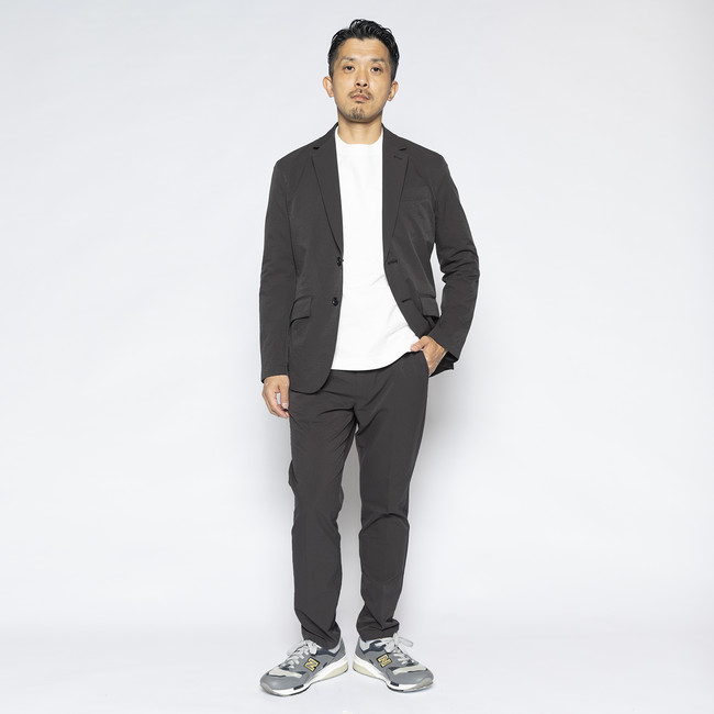 特徴:高温多湿の夏に向けた自社素材「ultimex COOL/アルティメックスクール」を使用し、通気性を上げるために見た目を損なわない細かな通気孔が空いた仕様になっているのに加え、ワッシャー加工により肌との接地面を軽減し、素肌に気持ちいい軽やかな着心地を実現。自社既存セットアップと比較し、伸縮性も高まり、22%軽量。着用時にシャツや下着が透けにくく、速乾に優れているので、汗をかいてもすぐに乾き、べたつきを解消するだけでなく、撥水加工も施しています。胸ポケットは、出し入れ可能なフェイクチーフ付き。左内ポケットにはファスナーがついており、スマホや名刺入れ、パスポートなどが収納可能。パンツはサイドをウエストゴムにすることで快適ながらすっきりとした見た目に。右サイドポケット横の目立ちにくいコンシールファスナーを使用したポケットには、落としたくないスマホやワイヤレスイヤフォンなどの小物が収納できます。