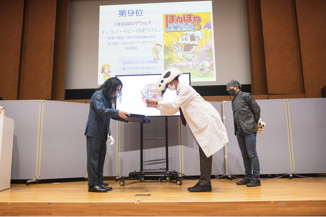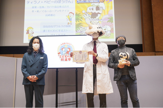 投票数は168,405票、発表に先駆け受賞イベントが行われました。会場にはお笑い芸人で作家の又吉直樹さんも登場。「ほねほねザウルス」からは「ぐるーぷ・アンモナイツ」(著作)のメンバーより、大崎悌造さん(構成・文)とドクター・ヨッシー(原案・カバヤ食品)が登壇し、公式アンバサダーの又吉直樹さんより賞状をいただきました。