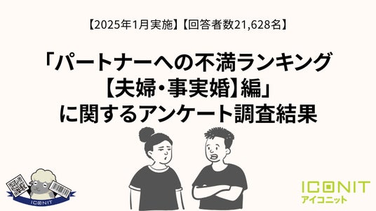 株式会社メディアシークが提供する累計3,600万DL超スマートフォンアプリ「QR/バーコードリーダー・アイコニット」内で、アプリユーザーを対象に毎日実施しているアンケート「アイコニット・リサーチ」において、「パートナーへの不満ランキング【夫婦・事実婚】編」に関するアンケートを21,628名に対して2025年1月18日に実施いたしました。