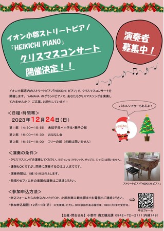 小郡市では、市民から寄贈されたグランドピアノをイオン小郡店内にストリートピアノとして設置しています。この冬、ストリートピアノを活用したクリスマスコンサートを開催!子どもから大人まで、ピアノが好きな方ならどなたでも演奏可能。演奏希望の方は、申込フォームからお申し込みください。