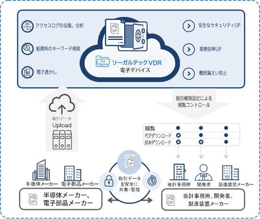 ・ソリューション内容: 電子デバイス業界では、技術や製造ラインを強化するためにM&Aが行われることが多く、デューデリジェンスにおいて大量の機密データを相手方と共有する必要があります。「リーガルテックVDR 電子デバイス」は、安全な環境でのデータ共有をサポートし、M&Aプロセス全体の効率化を実現します。