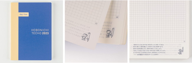「day-free」は、月間カレンダーと方眼ノートを組み合わせた月間ノート手帳です。日付がなくて自由に使える方眼ノートは、たっぷり171ページも。「day-free」だけの特徴は、方眼ノートの端にイラストが入ること。2023年版は、100%ORANGEさんの描いたパラパラマンガ「えんぴついっぽん」が印刷されています。サイズはオリジナルサイズとカズンサイズの2種類。それぞれのサイズのカバーを装着することもできます。