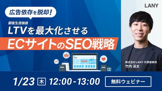 デジタルマーケティング支援を行う株式会社LANY(東京都渋谷区、代表取締役社長:竹内渓太)は、【無料ウェビナー】広告依存を脱却!LTVを最大化させるECサイトのSEO戦略を1/23(木)に開催いたします。