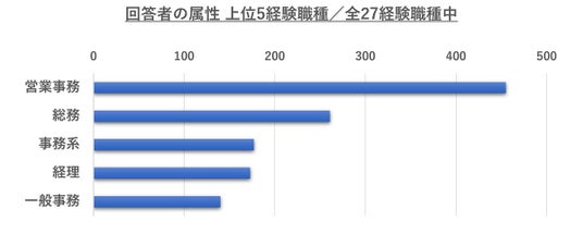 最も多いのは「営業事務」、次いで「総務」「事務系」「経理」「一般事務」といった、デスクワークがメインの職種が上位に並びました。