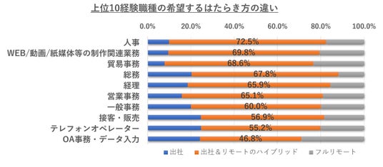全職種において「フルリモート&出社のハイブリッド」希望が最も多く、人気が高いことが明らかになりました。中でも「人事72.5%」「WEB/動画/紙媒体等の制作関連業務69.8%」、「貿易事務68.6%」が上位にランクインしています。次いで「フルリモート」希望では、「OA事務・データ入力29.0%」「貿易事務23.5%」「WEB/動画/紙媒体等の制作関連業務20.6%」とより専門特化した職種が上位になりました。