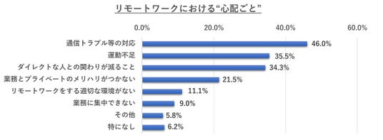 最も多いのは「通信トラブル等の対応46.0%」、次いで「運動不足35.5%」、「ダイレクトな人との関わりが減ること34.3%」が上位にランクイン。本結果より、仕事をスムーズに遂行するための“環境整備”、“健康”、“コミュニケーション” の側面が焦点になることがわかりました。フルリモートでも安心して業務遂行するためには、これらの懸念点をサポートしていくことが重要になると言えます。