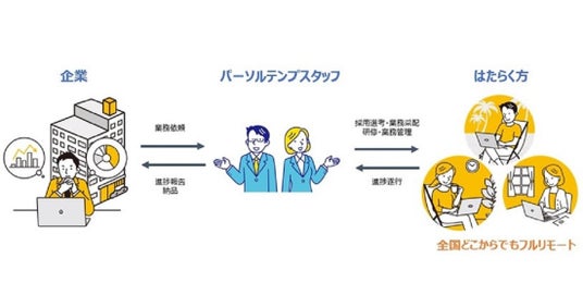『Remote Tasker』は、パーソルテンプスタッフが企業から受託した業務に最適なスキルや経験を持つ人材を登録スタッフや個人事業主の中から選考し、雇用契約を締結(個人事業主の方とは再委託契約を締結)し、当社社員が窓口となって、フルリモートではたらく方々との日々のコミュニケ―ションや業務の進捗管理、品質管理を行いながら、受託業務の安定運用を実現し、フルリモートであっても安心してはたらくことができる環境を整備します。
