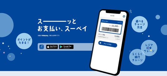 SU-PAYは株式会社SU-PAYが提供するオリジナル決済アプリです。銀行口座からの100円単位での直接オンラインチャージが可能であり、従来の現金チャージによるプリペイドカードよりもさらに便利で快適に、全国のトライアル店舗でのお買い物にご利用いただけます。