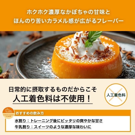 かぼちゃのほっくり感と、プリンのカラメル感を感じられる味わいのスイーツ系プロテインです。秋を感じるかぼちゃスイーツプロテインで、旬の味覚を満喫できるフレーバーです。