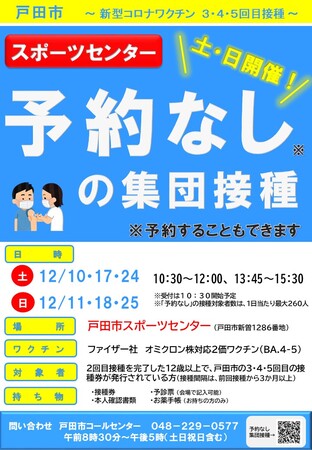 埼玉県戸田市では、2022年11月19日(土)以降の土曜日・日曜日に、集団接種を実施していますが、新型コロナウイルスの流行が懸念されている年末年始に向け、接種を希望する全ての対象者が年内に接種を受けられるよう、「予約なし」でも接種可能とすることを決定しました。