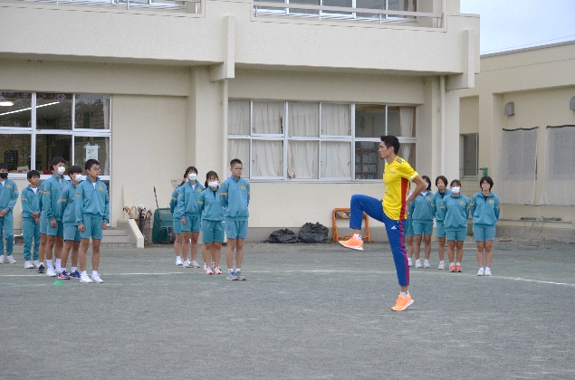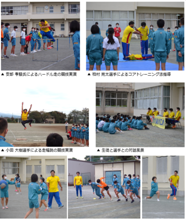 吉岡中学校陸上部に所属する生徒約40名を対象とした陸上教室では、400mH東京五輪 元日本代表の安部孝駿氏をはじめ、10月に行われた田島直人記念陸上競技大会で優勝を果たした柏村亮太選手(ハンマー投)や小田大樹選手(走幅跳)が、早く走るフォームのコツやボールを使用したコアトレーニング法等の指導を行いました。選手等による競技実演や、生徒と選手等との対話も交え、楽しみながらも真剣にトレージングに臨む生徒の姿勢が見られました。